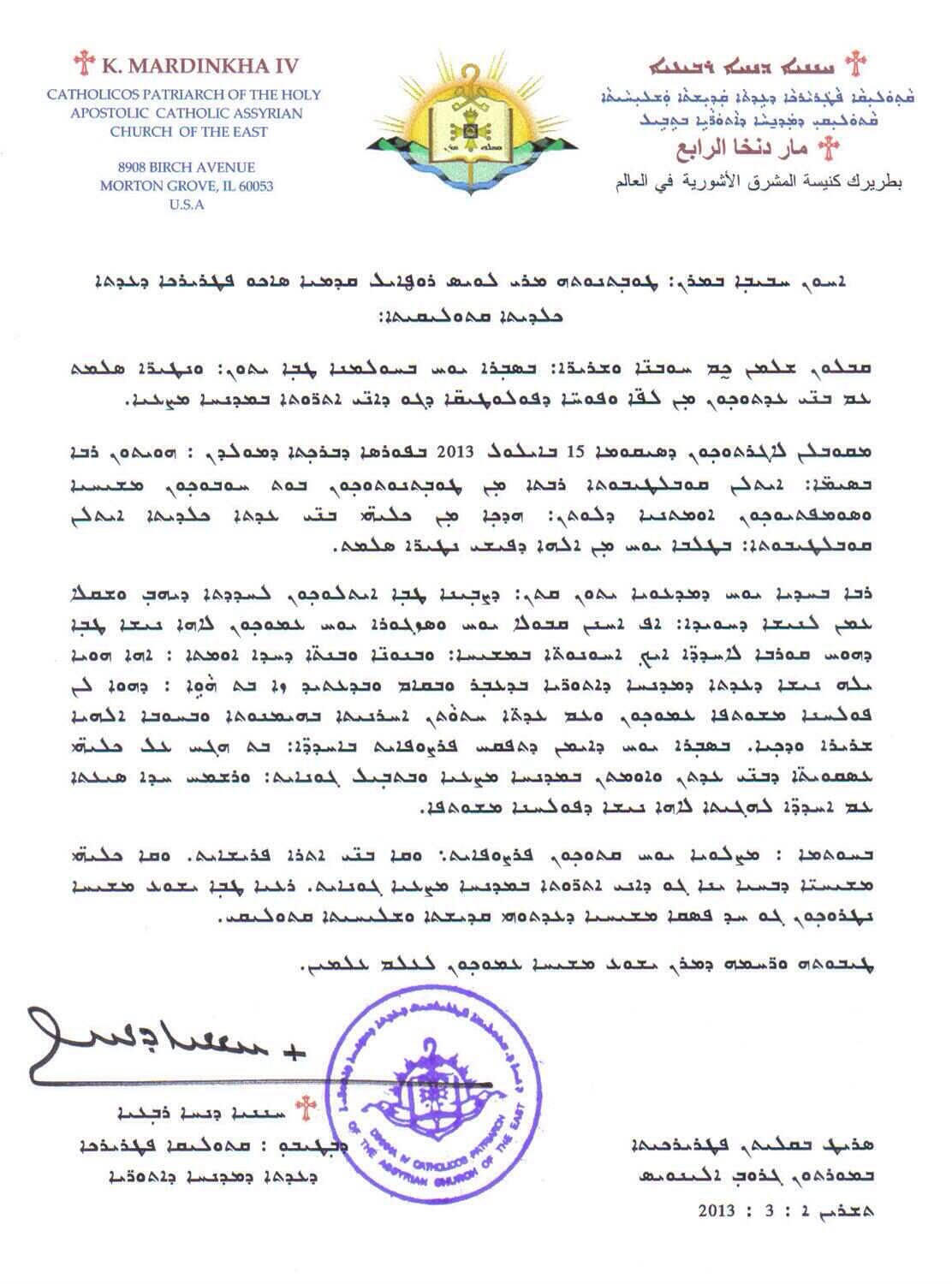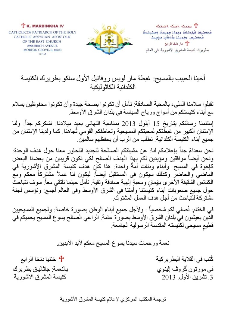قداسة البطريرك مار دنخا الرابع جاثاليق كنيسة المشرق الآشورية في العالم يبعث برسالة شكر لغبطة بطريرك الكنيسة الكلدانية الكاثوليكية 6 أكتوبر 2013 البلدان 30 زيارة شاركها Facebook Twitter Google + LinkedIn 2013-10-06 Shamasha Sami شاركها Facebook Twitter Google + LinkedIn