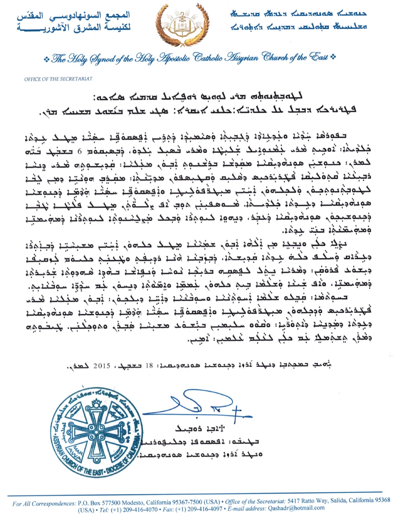 ختاما تقبلوا تحيات الأخوة والمحبة من أخيكم قداسة البطريرك مار دنخا الرابع بطريرك وكافة المطارنة والأساقفة الأجلاء أعضاء المجمع المقدس لكنيسة المشرق الآشورية ليتعزز أملنا ورجاؤنا بيسوع المسيح وتعم علينا جميعاً نعمة الرب إلى أبد الآبدين آمين.