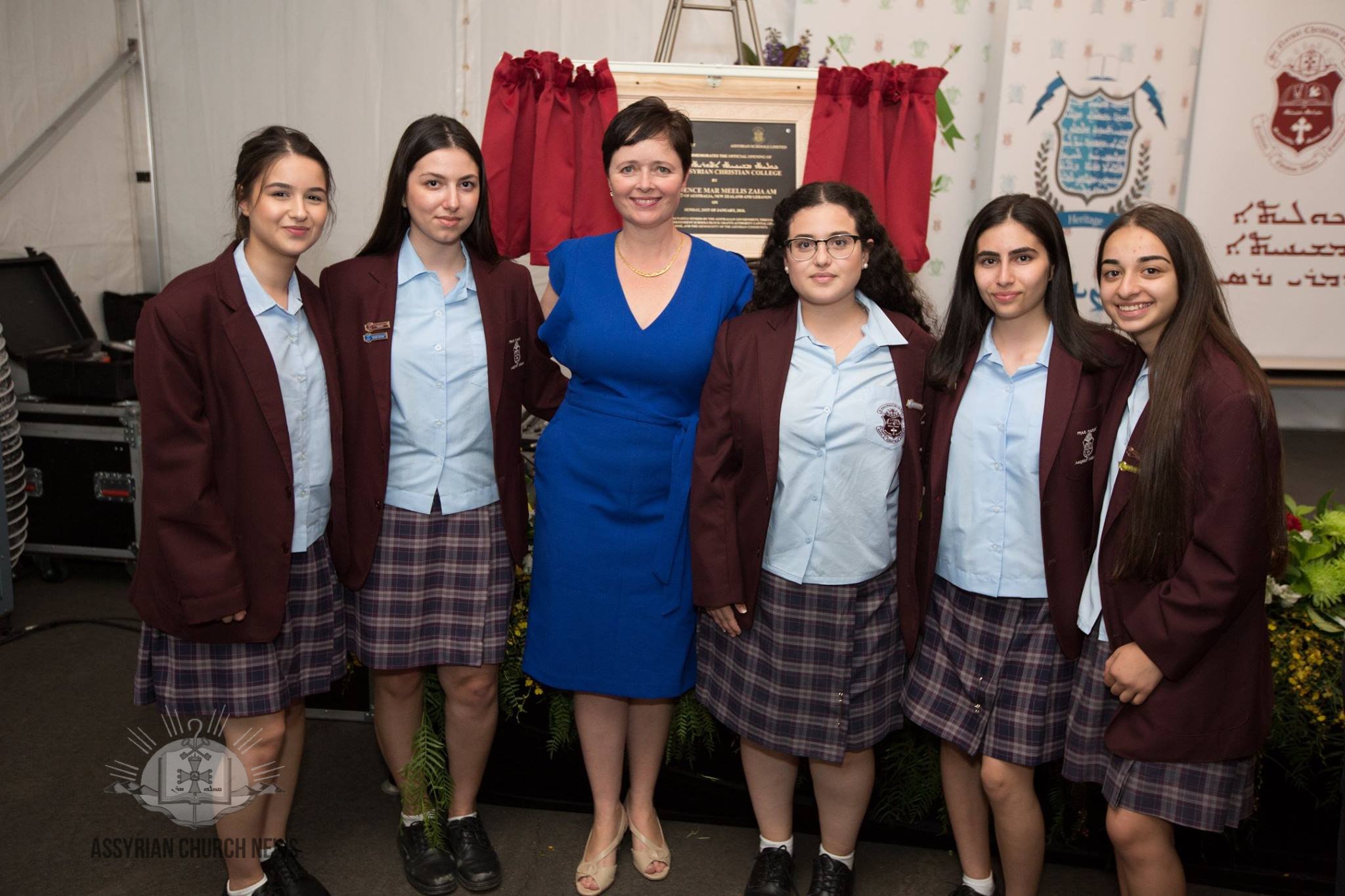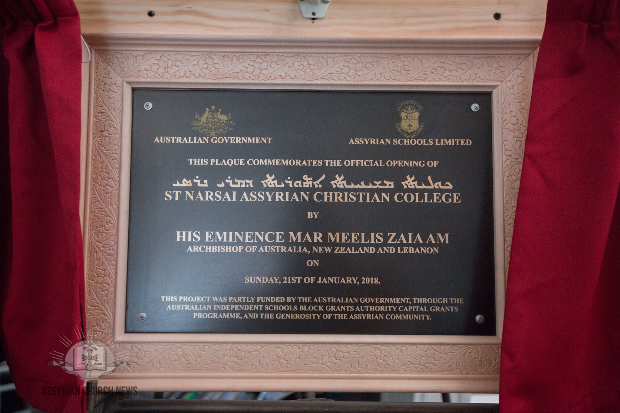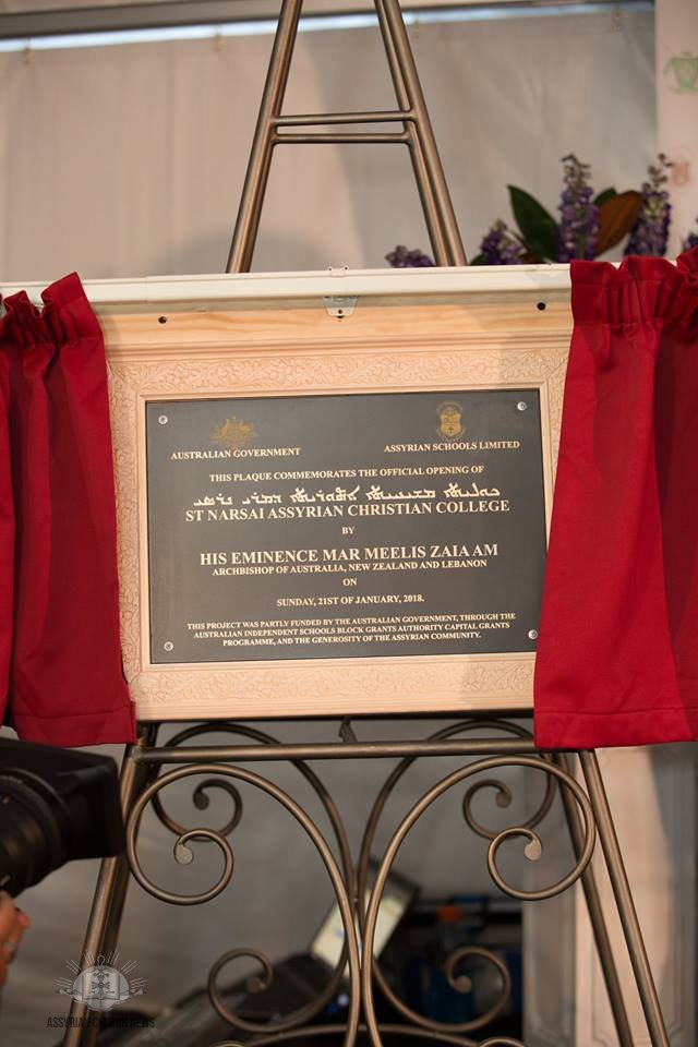 ثم ازاح غبطة المطران مار ميلس زيا بمرافقة كل من، معالي كلادس بيريجيكليان، رئيسة وزراء حكومة ولاية نيو ساوث ويلز، ومعالي السيدة تانيا دافيز، عضوة برلمان الولاية عن منطقة مالكاوا، والسيد لوك فولي، زعيم المعارضة العمالية، والسيد كارث وارد بالإنابة عن وزير التعليم الأسترالي، روب ستوكيس، الستار عن لوحة تدشين كلية مار نرساي الآشورية.