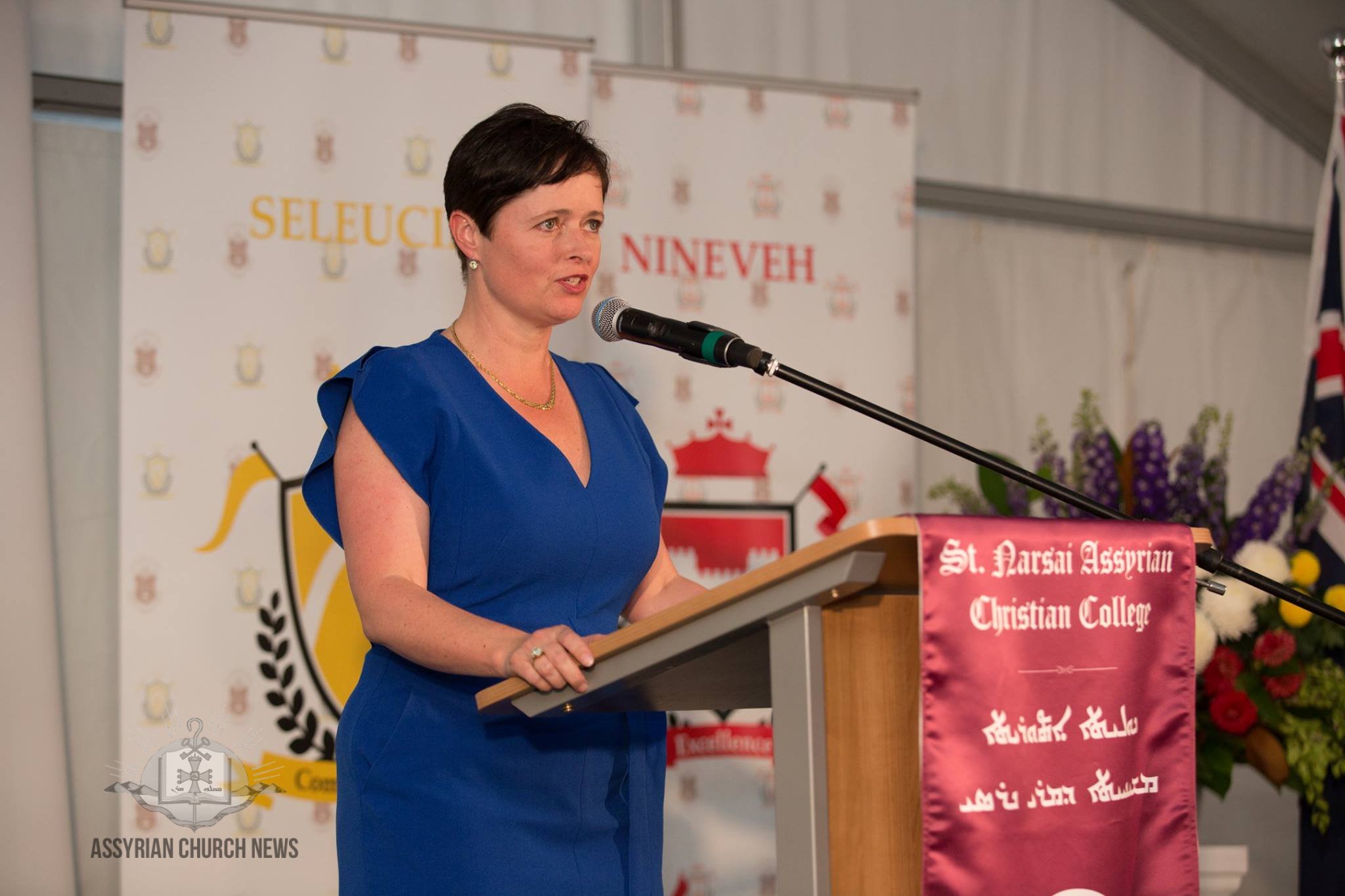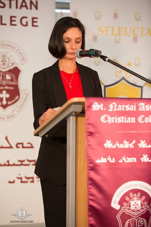 ولكونها ابنة لمهاجرين أرمن من الشرق الأوسط، أوضحت انها تقدر ومن خلال التنوع، المرونة في بناء جيل جديد قادم من القادة، ليس فقط كقادة استراليين عظماء، بل محافظين على ميراث والثقافة الآشورية وان كل طالب يعبر من خلال أبواب هذه الكلية، يتولد لديه الإحساس بالتاريخ والمسؤولية والاحترام، وانها كرئيسة حكومة تفتخر بمثل هذه المدارس لان التأريخ الذي يمثل آلاف السنين على الأرض، له مدرسة في قلب ولاية نيو ساوث ويلز، وان طلبة هذه المدرسة سيفتخرون بأسلافهم ومن أين جاءوا، ومن دون شك ان مثل هذا اليوم هو مثار فخر للآشوريين، وفخر لها ولزملائها لان هذه المدرسة تمثل الأفضل للمستقبل.