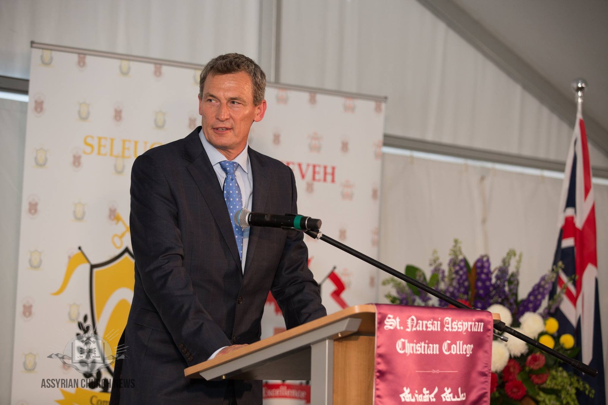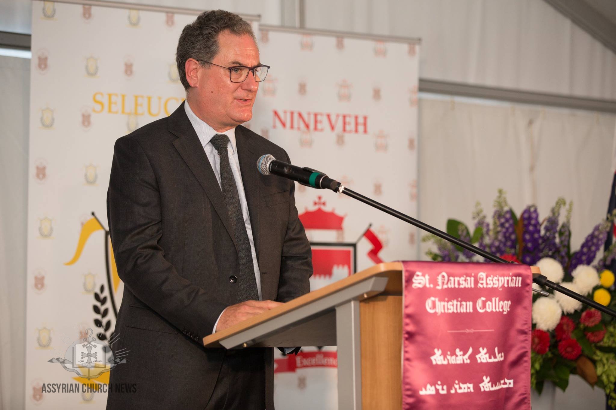 ثم تعاقب كل من السيد براين كينلي، رئيس مدراء المدارس الآشورية المحدودة، والسيد بول كريستوفر، المدير الإداري لمشروع البناء، والسيد اندرو بيندر، مدير شعبة إدارة المشروع، والنائب غاريث وارد السكرتير البرلماني للتعليم، في القاء كلماتهم بهذه المناسبة.