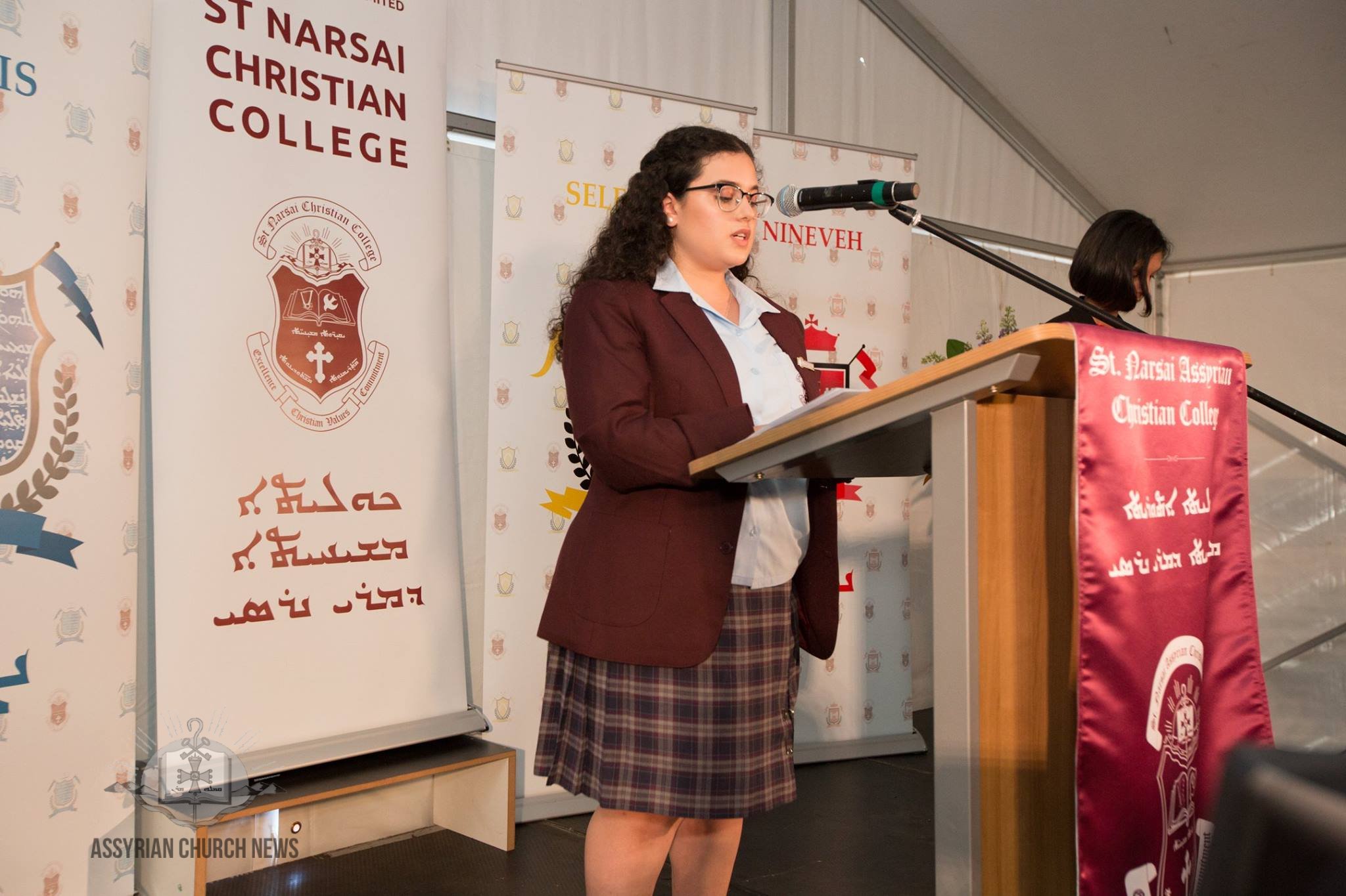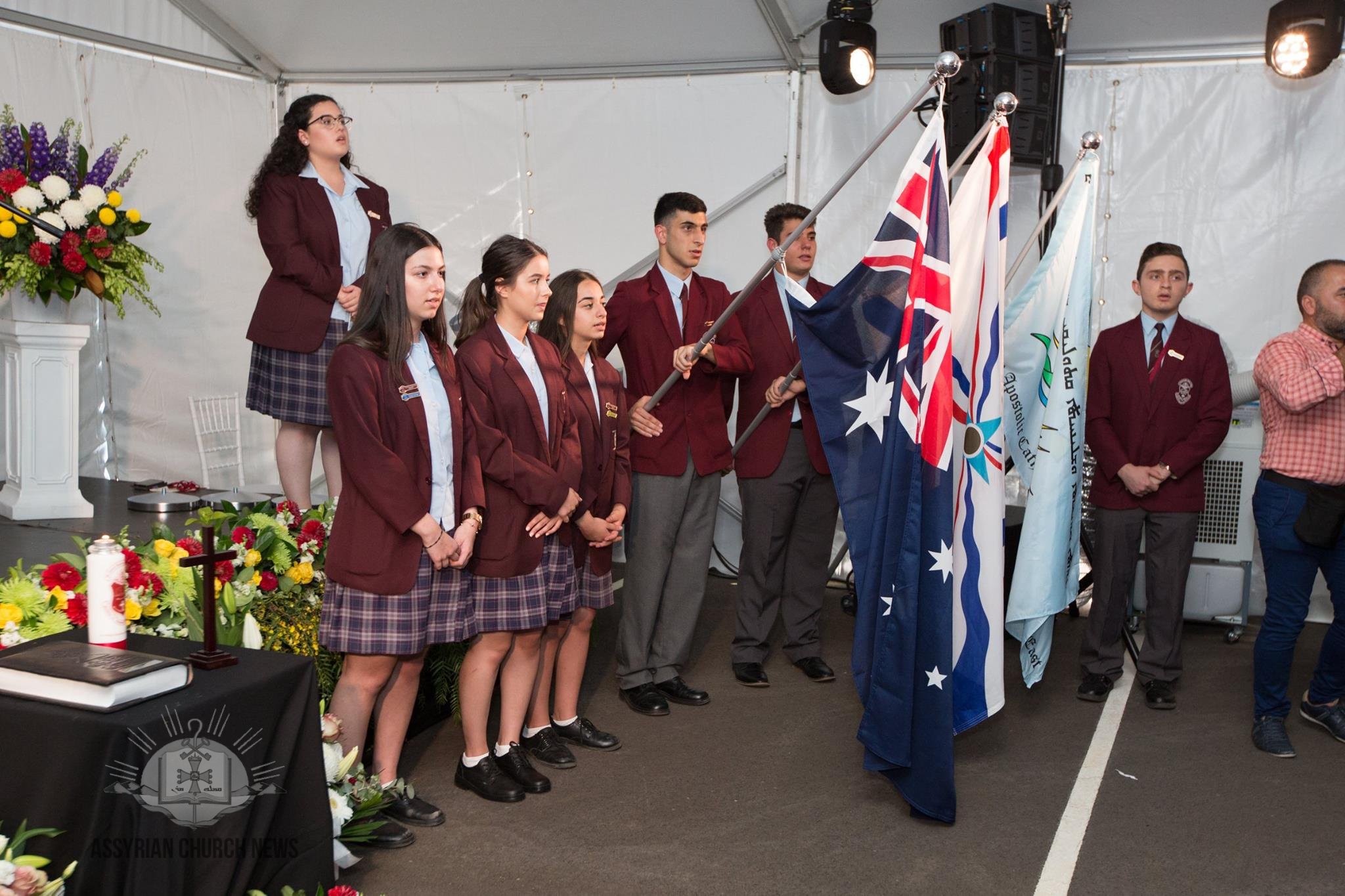 وفي بدء الاحتفال الرسمي، رحبت السيد ماري كينا، معاونة في الكلية، بالضيوف الكرام ليبتدأ الحفل بالنشيد الوطني الأسترالي، وكنيسة المشرق والأمة الآشورية، اعقبتها الطالبة أديسا شموئيل، طالبة المرحلة 12 بتقديم صلاة خاصة للكلية.