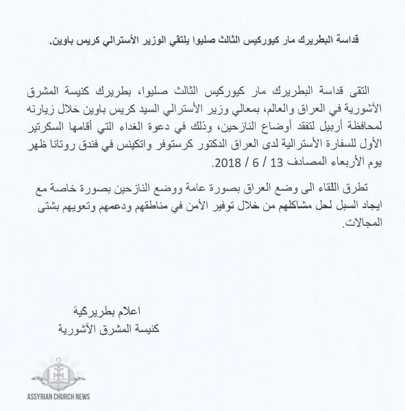 قداسة البطريرك مار كيوركيس الثالث صليوا، يلتقي الوزير الاسترالي كريس باوين 16 يونيو 2018 العراق وايران وروسيا, مميز 329 زيارة شاركها Facebook Twitter Google + 2018-06-16 القس شموئيل