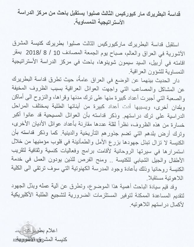 قداسة البطريرك مار كيوركيس الثالث صليوا يستقبل باحث من مركز الدراسة النمساوية 12 أغسطس 2018 العراق وايران وروسيا, مميز 260 زيارة شاركها Facebook Twitter Google + 2018-08-12 القس شموئيل