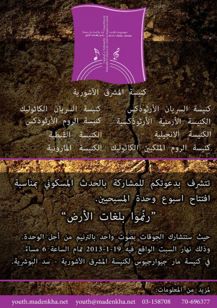 الحدث: امسية مسكونية لقراءات كتابية وتاملات وتراتيل روحية باللغات: العربية، السريانية (الغربية)، الارمنية، اليونانية، القبطية بالاضافة الى الاشورية