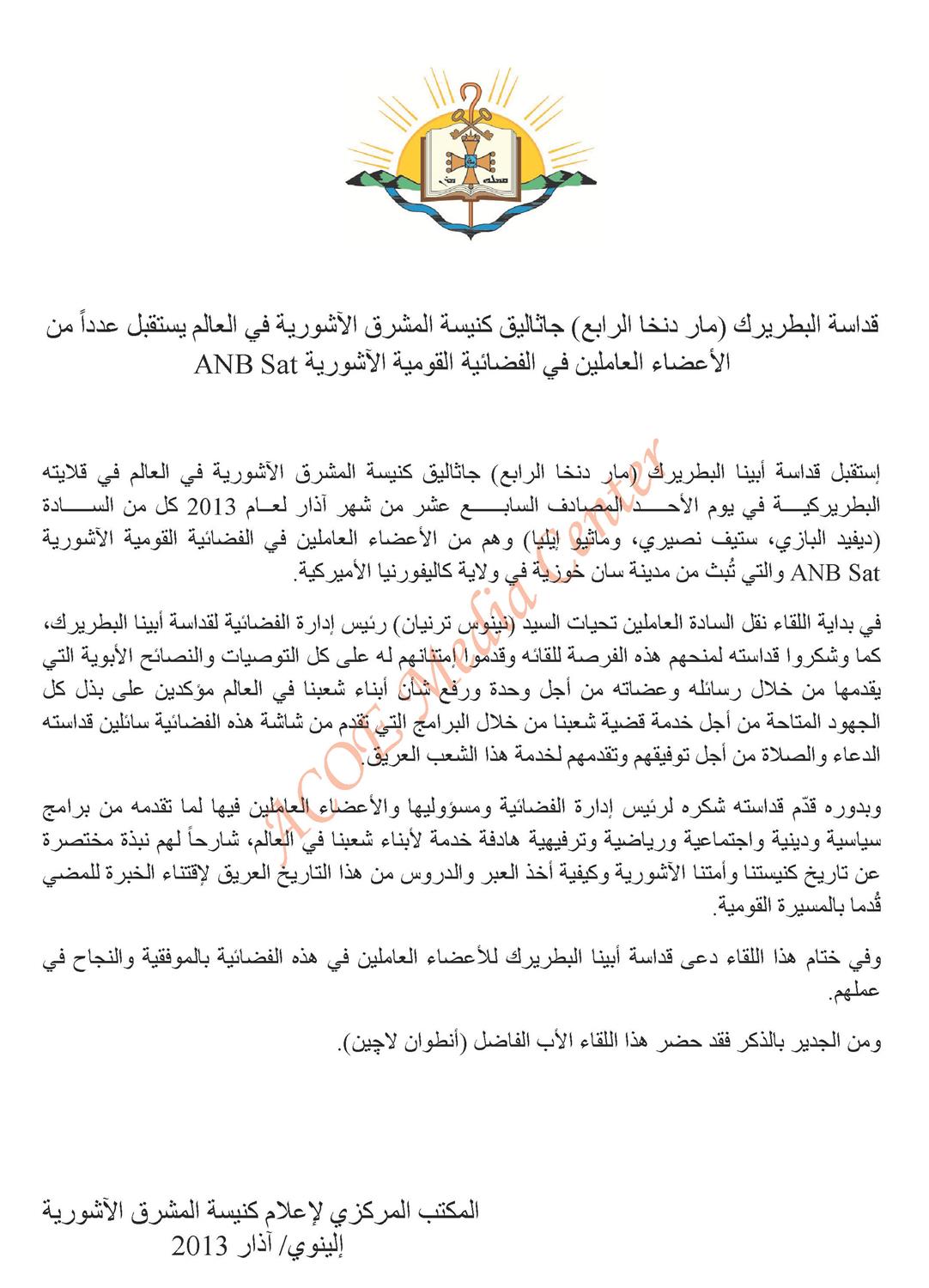 قداسة البطريرك مار دنخا الرابع يستقبل عدد من عاملي فضائية ANB 24 مارس 2013 شرق الولايات المتحدة الأمريكية 331 زيارة شاركها Facebook Twitter Google + 2013-03-24 القس شموئيل
